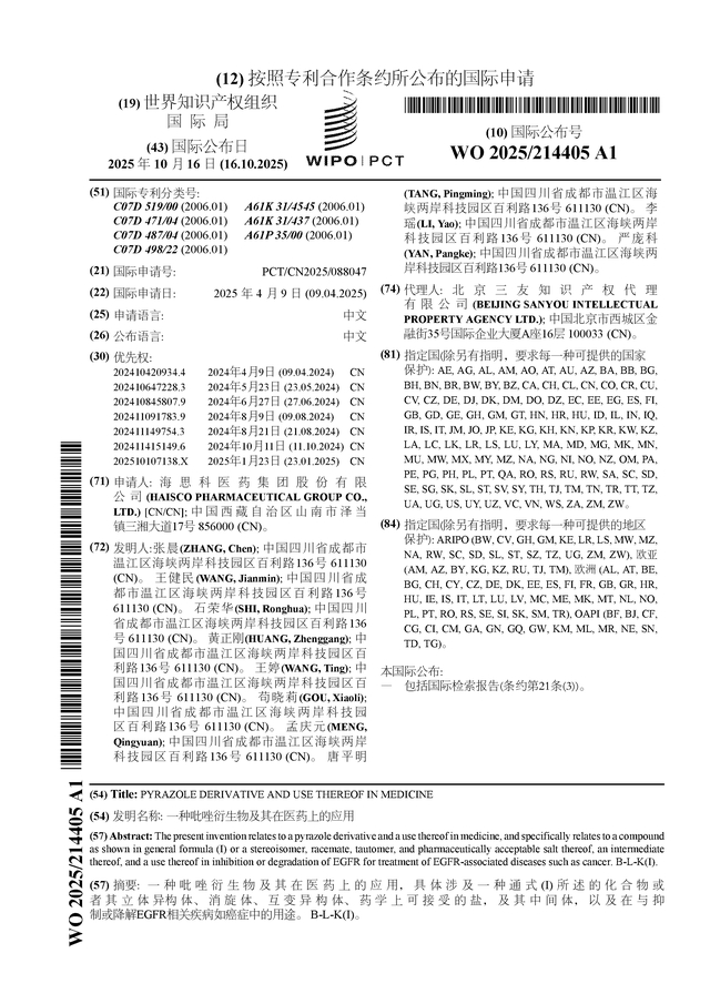 海思科公布国际专利申请:“一种吡唑衍生物及其在医药上的应用”