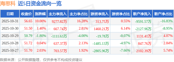 10月31日的资金流向数据方面,主力资金净流入9277.82万元,占总成交额16.28%,游资资金净流入313.75万元,占总成交额0.55%,散户资金净流出9591.57万元,占总成交额16.83%。