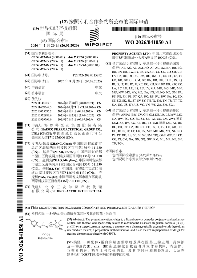 海思科公布国际专利申请:“一种配体-蛋白降解剂偶联物及其在医药上的应用”