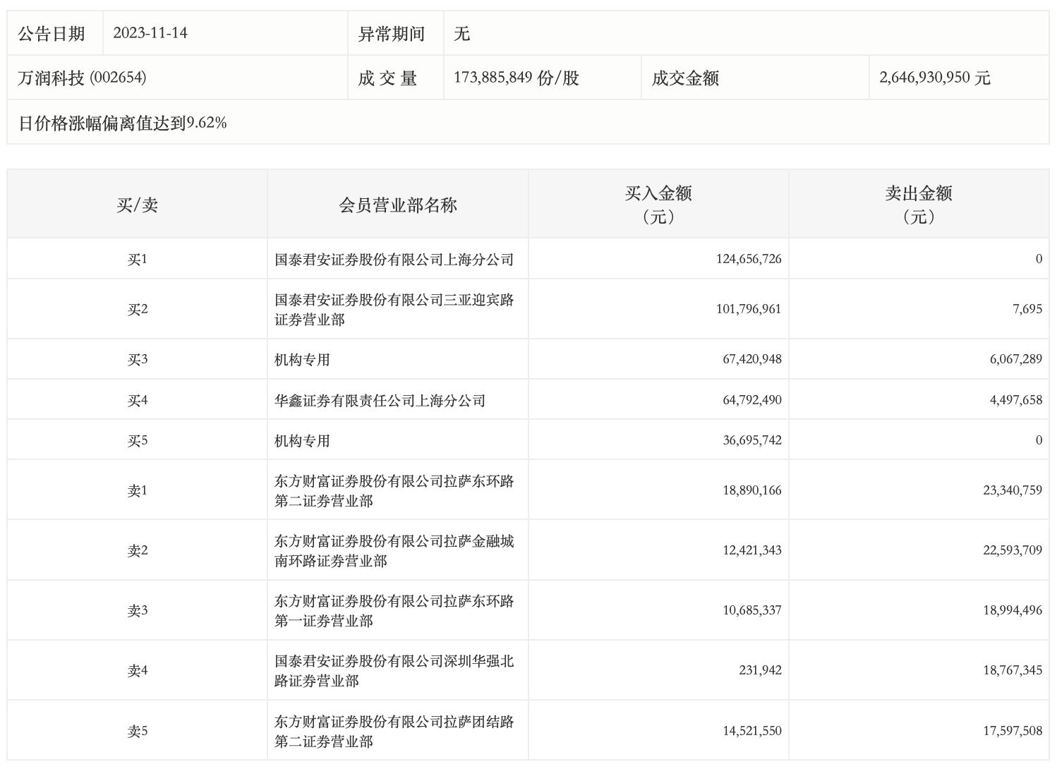11月14日,万润科技今日涨停,全天换手率达22.18%,振幅达11.36%。龙虎榜数据显示,营业部席位合计净买入3.4亿元。其中,机构买入1.04亿元,卖出606.73万元,合计净买入9804.94万元。此外,国泰君安证券上海分公司、国泰君安证券三亚迎宾路证券营业部分别买入1.25亿元、1.02亿元;东方财富证券拉萨东环路第二证券营业部、东方财富证券拉萨金融城南环路证券营业部分别卖出2334.08万元、2259.37万元。