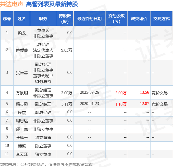 共达电声近半年内的董监高及核心技术人员增减持详情如下: