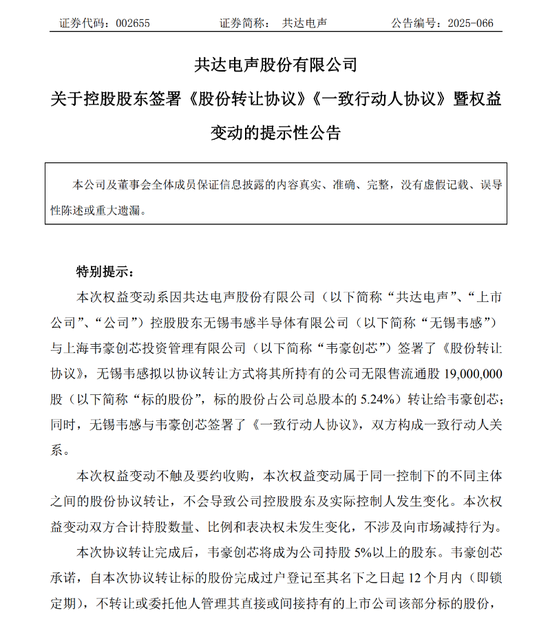 共达电声表示,此次权益变动属于同一控制下的不同主体之间的股份协议转让,不会导致公司控股股东及实控人发生变化。