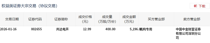 1月16日,共达电声大宗交易成交400万股,成交额5196万元,占当日总成交额的19.55%,成交价12.99元,较市场收盘价13.15元折价1.22%。