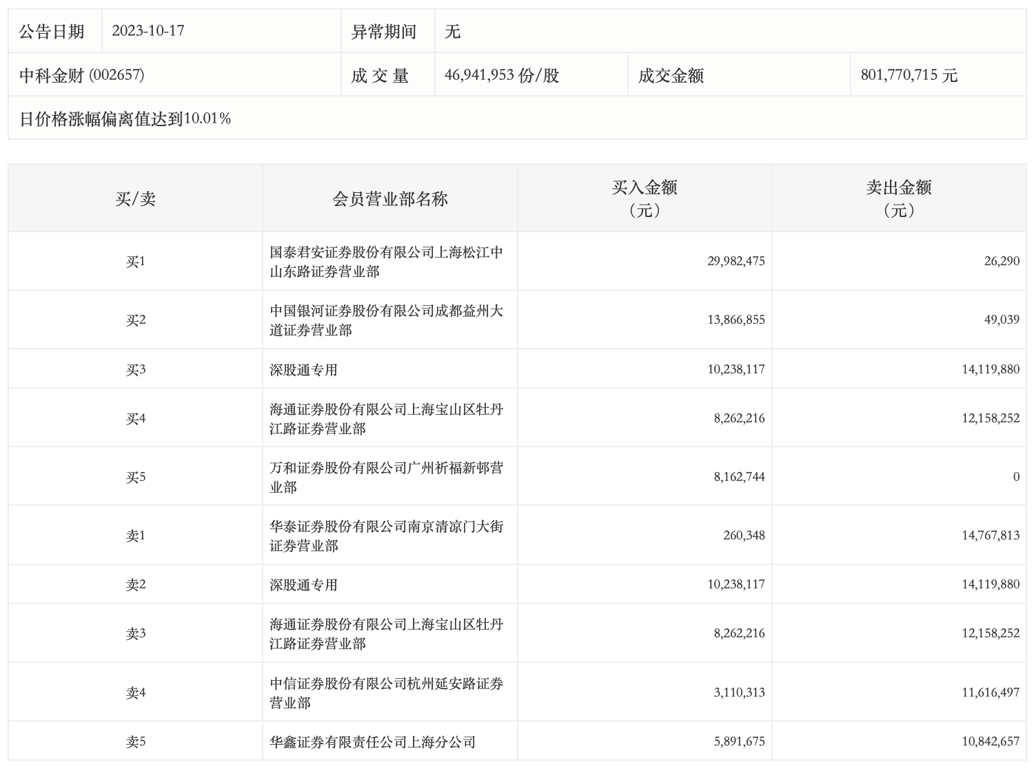 10月17日,中科金财今日涨停,全天换手率达14.01%,振幅达8.4%。龙虎榜数据显示,营业部席位合计净买入1619.43万元。其中,国泰君安证券上海松江中山东路证券营业部、中国银河证券成都益州大道证券营业部分别买入2998.25万元、1386.69万元;华泰证券南京清凉门大街证券营业部、深股通专用分别卖出1476.78万元、1411.99万元。