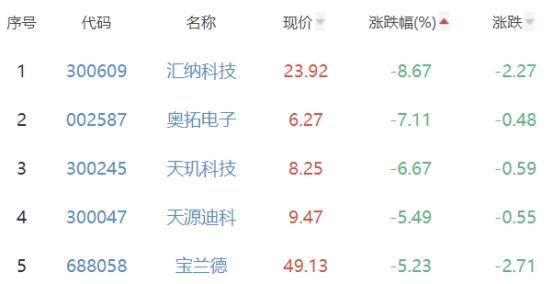 汇纳科技、奥拓电子、天玑科技、天源迪科、宝兰德(维权)位列涨幅榜后五位,涨幅分别为-8.67%、-7.11%、-6.67%、-5.49%、-5.23%。