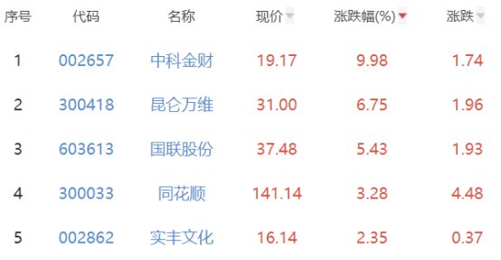 其中,中科金财、昆仑万维、国联股份、同花顺、实丰文化位列板块涨幅前五位,涨幅分别为9.98%、6.75%、5.43%、3.28%、2.35%。