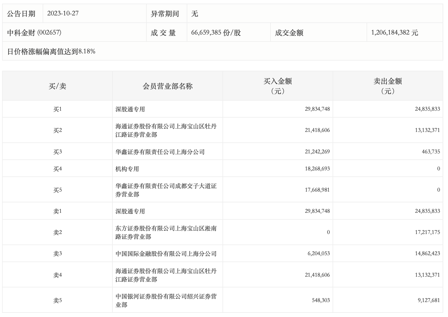10月27日,中科金财今日涨停,龙虎榜数据显示,上榜营业部席位全天成交1.95亿元,占当日总成交金额比例为16.15%。其中,买入金额为1.15亿元,卖出金额为7963.92万元,合计净买入3554.64万元。