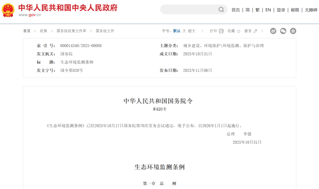 近日,《生态环境监测条例》经国务院常务会议通过并正式发布,将于2026年1月1日起施行。