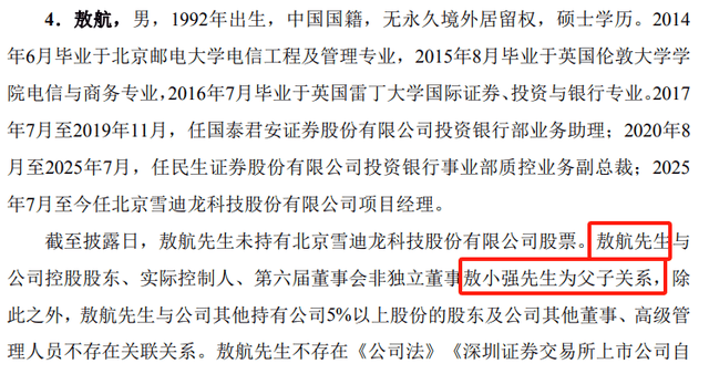 到2025年7月,敖航离开金融圈,加入北京雪迪龙科技股份有限公司担任项目经理,这家公司正是敖航的父亲敖小强创立的企业,老爷子手握着上市公司57%的股份,是绝对的掌门人。