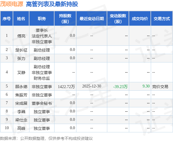 证券之星消息,根据12月31日市场公开信息、上市公司公告及交易所披露数据整理,茂硕电源(002660)最新董监高及相关人员股份变动情况:2025年12月30日公司董事顾永德共减持公司股份39.23万股,占公司总股本为0.11%。变动期间公司股价下跌0.75%,12月30日当日收盘报9.29元。