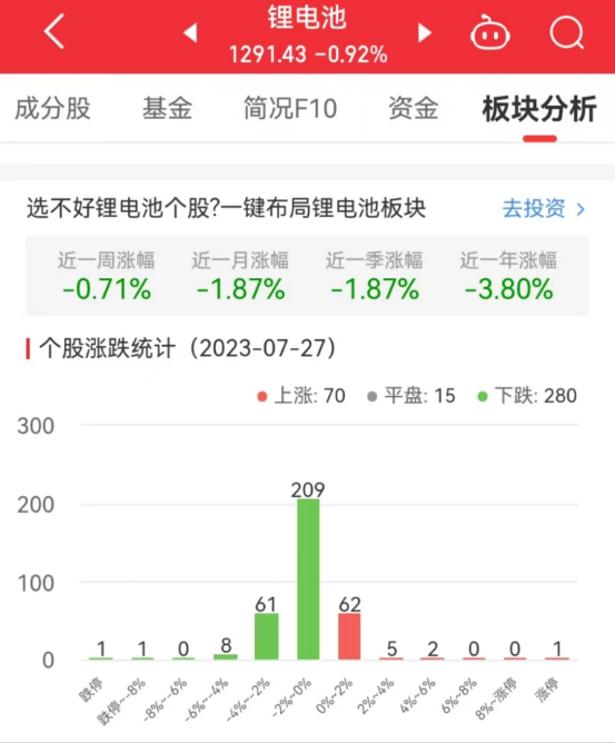 中国经济网北京7月27日讯今日,锂电池板块整体跌幅0.92%,其中70只股票上涨,15只股票平盘,280只股票下跌。