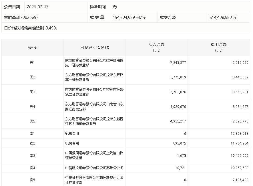 7月17日,首航高科今日跌停,龙虎榜数据显示,上榜营业部席位全天成交9885.64万元,占当日总成交金额比例为19.22%。其中,买入金额为3169.27万元,卖出金额为6716.36万元,合计净卖出3547.09万元。