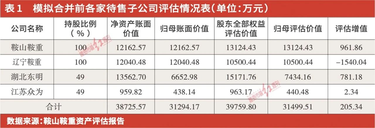 在评估报告中,假设鞍重股份以其持有的对辽宁鞍重、湖北东明、江苏众为的长期股权投资账面价值对鞍山鞍重出资,该项出资于2021年12月31日已完成,并持续至2022年12月31日。经过评估,在资产基础法下,模拟母公司口径净资产账面价值为36137.74万元,评估价值为31499.51万元,减值额为4638.23万元,减值率为12.83%。而实际上,按照模拟合并前,各家公司资产评估情况来看,其资产合计还是有小幅度增值的(详见表1),评估增值205.34万元