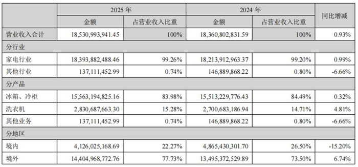 “全球化”与“智慧家电”是TCL智家坚定实施的双轮战略。目前,TCL冰箱和洗衣机销售业务覆盖全球80多个国家和地区,在泰国、菲律宾、法国等国家已实现主流渠道覆盖;旗下奥马冰箱则连续17年位居中国冰箱出口总量第一,连续18年位居中国冰箱出口欧洲第一。2023年公司海外收入突破百亿元,增速高达五成以上。但进入2024年后,该增速已经放缓至约32%。时至2025年,海外市场贡献144.05亿元收入,增速则仅6.74%。而公司境内市场表现持续疲弱也令营收端增长承压。2025年公司境内收入降至41.26亿元,降幅约15%。