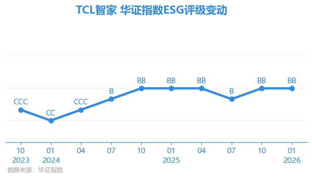日前,华证指数公布了新一期(2026年1月31日)的ESG评级结果,TCL智家(002668.SZ)获得BB评级(华证指数评级为C起至AAA九档,C为最低档,AAA为其最高一级评级/AA为其第二档),上一期(2025年10月31日)ESG评级为BB。本期ESG评级在148家家庭耐用消费品行业A股上市公司中排名第31(上一期排名第32)。