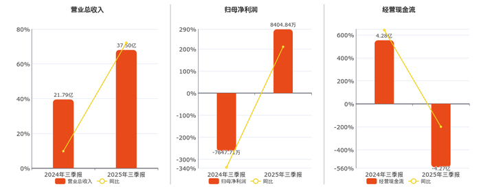 公司营业总收入为37.50亿元,较去年同报告期营业总收入增加15.71亿元,实现5年连续上涨,同比较去年同期上涨72.10%。归母净利润为8404.84万元,较去年同报告期归母净利润增加1.61亿元。经营活动现金净流入为-4.27亿元。