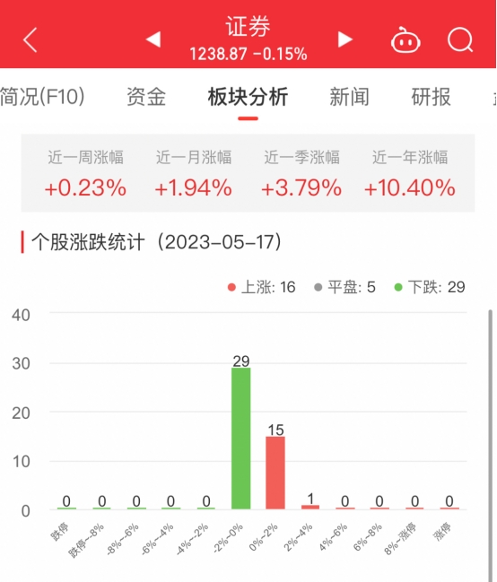 中国经济网北京5月17日讯今日,证券板块整体涨幅-0.15%,其中16只股票上涨,5只平盘,29只股票下跌。