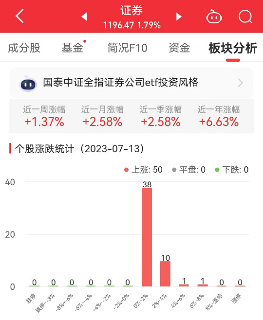 中国经济网北京7月13日讯 今日,证券板块整体涨幅1.79%,其中,50只股票上涨。