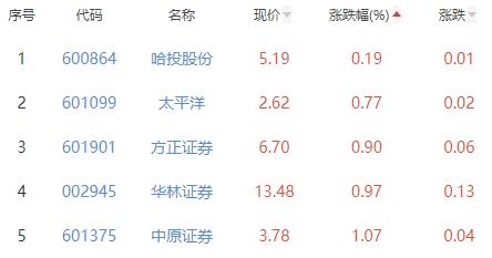 哈投股份、太平洋、方正证券、华林证券、中原证券位列涨幅榜后五位,涨幅分别为0.19%、0.77%、0.90%、0.97%、1.07%。