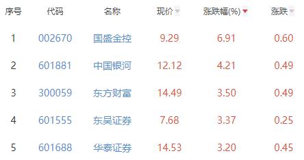 其中,国盛金控、中国银河、东方财富、东吴证券、华泰证券位列板块涨幅前五位,涨幅分别为6.91%、4.21%、3.50%、3.37%、3.20%。