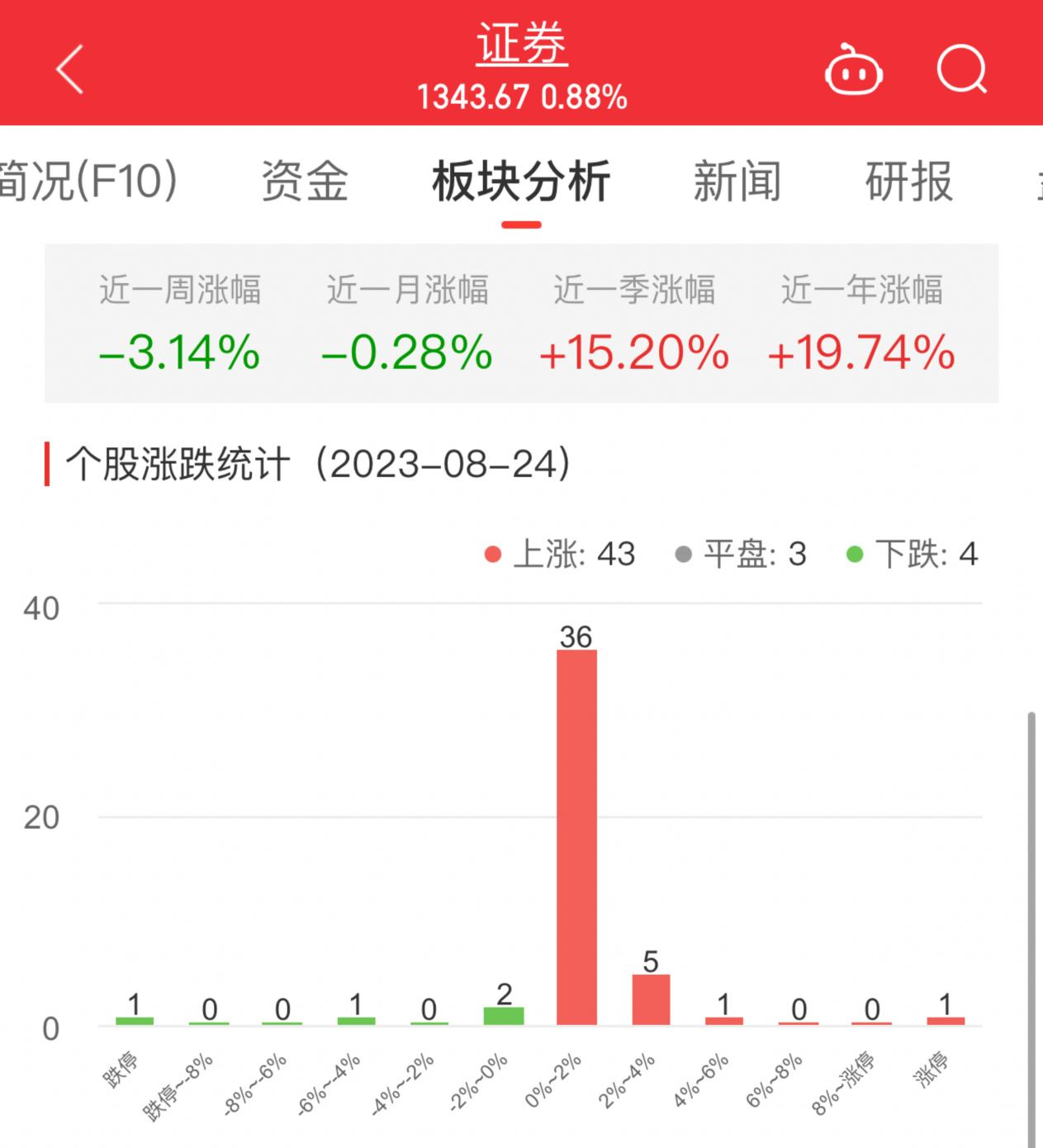 中国经济网北京8月24日讯 今日,证券板块整体涨幅0.88%,其中43只股票上涨,3只股票平盘,4只股票下跌。