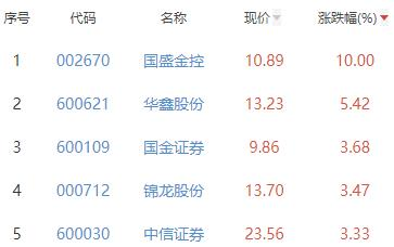 其中,国盛金控(维权)、华鑫股份、国金证券、锦龙股份、中信证券位列板块涨幅前五位,涨幅分别为10.00%、5.42%、3.68%、3.47%、3.33%。