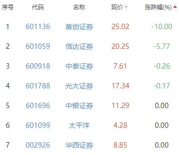首创证券、信达证券、中泰证券、光大证券(维权)、中银证券、太平洋、华西证券位列涨幅榜后五位,涨幅分别为-10.00%、-5.77%、-0.26%、-0.17%、0.00%、0.00%、0.00%。