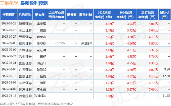 三维化学2025年三季报显示,前三季度公司主营收入19.41亿元,同比上升14.63%;归母净利润1.53亿元,同比上升5.14%;扣非净利润1.53亿元,同比上升6.86%;其中2025年第三季度,公司单季度主营收入6.92亿元,同比上升3.61%;单季度归母净利润3310.29万元,同比下降46.18%;单季度扣非净利润3306.34万元,同比下降45.92%;负债率21.05%,投资收益1154.62万元,财务费用-48.11万元,毛利率17.77%。