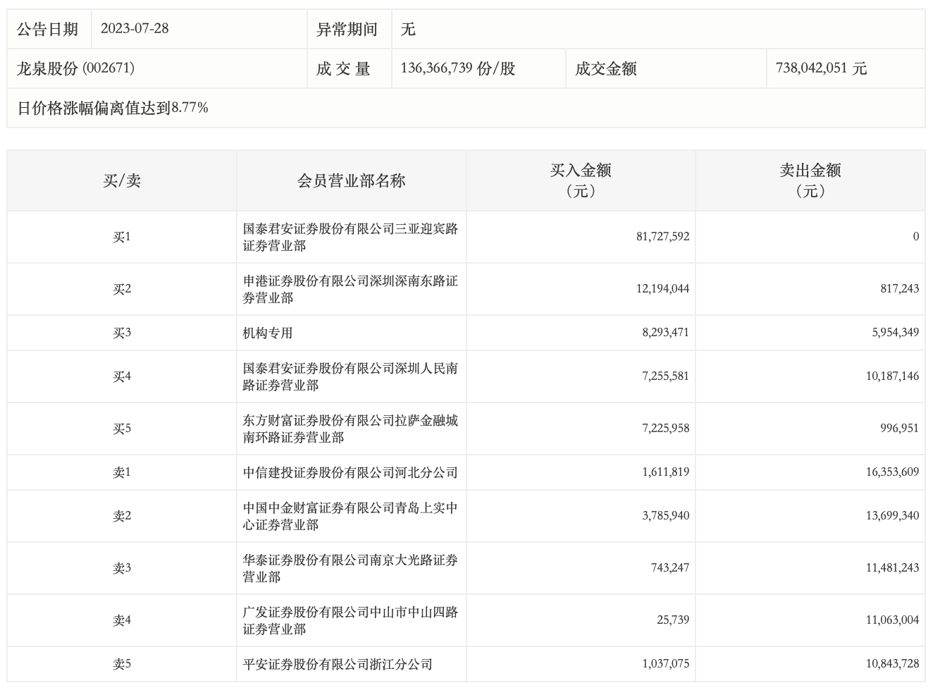 7月28日,龙泉股份今日涨停,龙虎榜数据显示,上榜营业部席位全天成交2.05亿元,占当日总成交金额比例为27.82%。其中,买入金额为1.24亿元,卖出金额为8139.66万元,合计净买入4250.39万元。