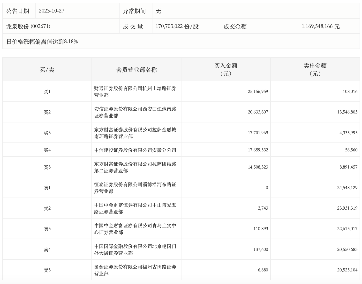 10月27日,龙泉股份今日涨停,全天换手率达30.83%,振幅达5.44%。龙虎榜数据显示,营业部席位合计净卖出4318.84万元。其中,财通证券杭州上塘路证券营业部、安信证券西安曲江池南路证券营业部分别买入2515.70万元、2063.38万元;恒泰证券淄博沿河东路证券营业部、中国中金财富证券有限公司中山博爱五路证券营业部分别卖出2454.81万元、2393.13万元。