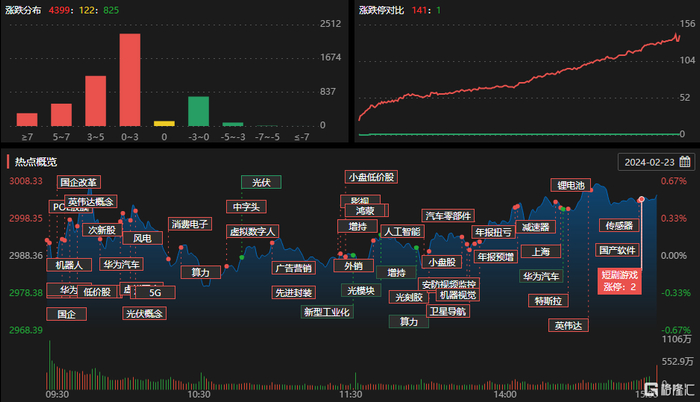 市场近4400股上涨,141只个股涨停,1只个股跌停。盘面上,机器人、Sora概念持续走高;零售、汽车整车板块拉升。煤炭板块震荡走低;茅指数等板块跌幅居前。