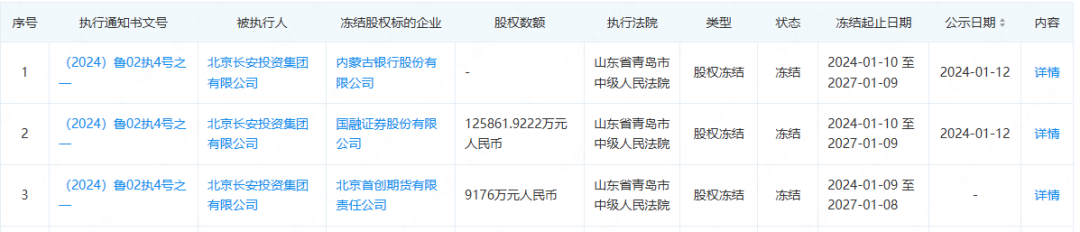 不仅如此,长安投资持有的国融证券股权以及首创期货股权也被冻结。企查查显示,冻结起止日期均是2024年1月10日至2027年1月9日,执行法院是山东省青岛市中级人民法院,疑似申请执行人是青岛国信发展(集团)有限责任公司(下称,青岛国信)。
