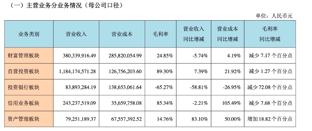 具体来看,主营业务方面,西部证券上半年投资银行、财富管理、信用业务板块的营业收入出现同比下降。其中,投行业务是西部证券上半年表现最差的板块,营业收入下降58.81%。除此之外,西部证券资产管理和自营投资业务的营业收入实现同比增长,分别增加83.10%、7.39%。