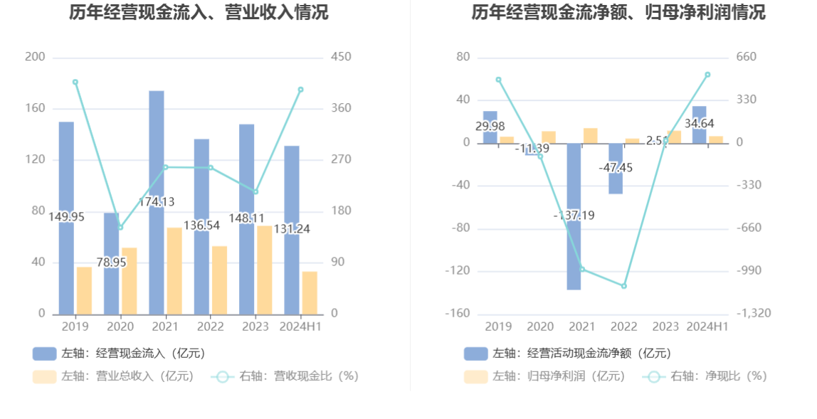 2024年上半年,公司经营活动现金流净额为34.64亿元,同比增加34.90亿元;筹资活动现金流净额-12.32亿元,同比增加3.35亿元;投资活动现金流净额-1.09亿元,上年同期为-2457.79万元。