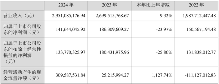 2024年,公司实现营业收入29.51亿元,同比增长9.32%;归属于上市公司股东的净利润1.42亿元,同比下降23.97%;归属于上市公司股东的扣非净利润1.34亿元,同比下降25.86%;经营活动产生的现金流量净额为3.10亿元,同比增长1127.74%。