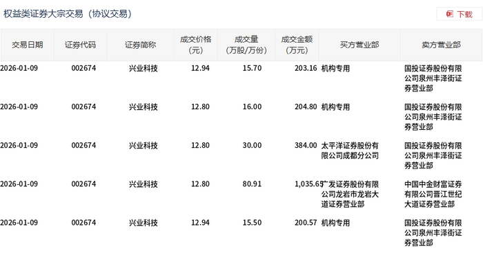 兴业科技今日大宗交易成交158.11万股,成交额2028.18万元