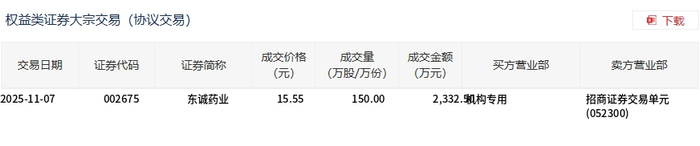 11月7日,东诚药业大宗交易成交150万股,成交额2332.5万元,占当日总成交额的24.51%,成交价15.55元,较市场收盘价15.55元持平。