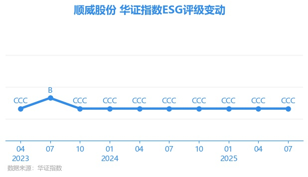 日前,华证指数公布了新一期(2025年7月31日)的ESG评级结果,顺威股份(002676.SZ)获得CCC评级(华证指数评级为C起至AAA九档,C为最低档,AAA为其最高一级评级/AA为其第二档),上一期(2025年4月30日)ESG评级为CCC。本期ESG评级在147家家庭耐用消费品行业A股上市公司中排名第101(上一期排名第101)。