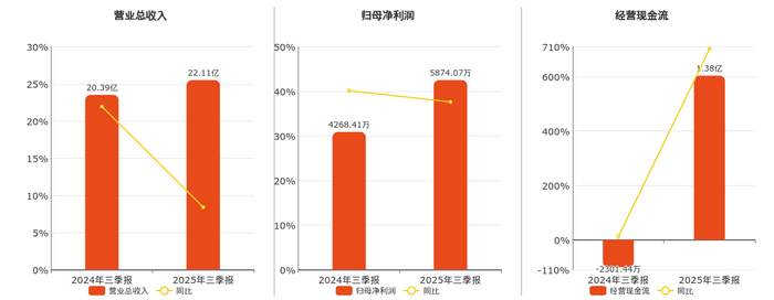 公司营业总收入为22.11亿元,较去年同报告期营业总收入增加1.72亿元,实现3年连续上涨,同比较去年同期上涨8.41%。归母净利润为5874.07万元,较去年同报告期归母净利润增加1605.65万元,实现2年连续上涨,同比较去年同期上涨37.62%。经营活动现金净流入为1.38亿元,较去年同报告期经营活动现金净流入增加1.61亿元,实现2年连续上涨。