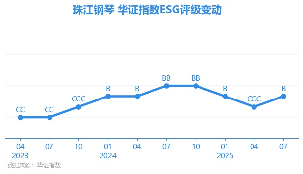 日前,华证指数公布了新一期(2025年7月31日)的ESG评级结果,珠江钢琴(002678.SZ)获得B评级(华证指数评级为C起至AAA九档,C为最低档,AAA为其最高一级评级/AA为其第二档),上一期(2025年4月30日)ESG评级为CCC。本期ESG评级在30家休闲设备与用品行业A股上市公司中排名第10(上一期排名第6)。
