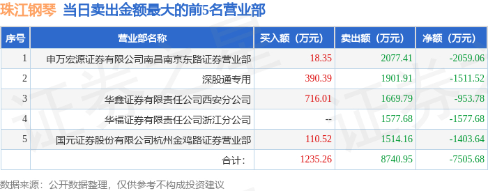 证券之星消息,沪深交易所2025年10月27日公布的交易公开信息显示,珠江钢琴(002678)因日跌幅偏离值达到7%的前5只证券登上龙虎榜。此次是近5个交易日内第3次上榜。
