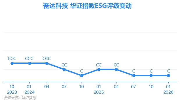 日前,华证指数公布了新一期(2026年1月31日)的ESG评级结果,奋达科技(002681.SZ)获得C评级(华证指数评级为C起至AAA九档,C为最低档,AAA为其最高一级评级/AA为其第二档),上一期(2025年10月31日)ESG评级为C。本期ESG评级在148家家庭耐用消费品行业A股上市公司中排名第137(上一期排名第133)。