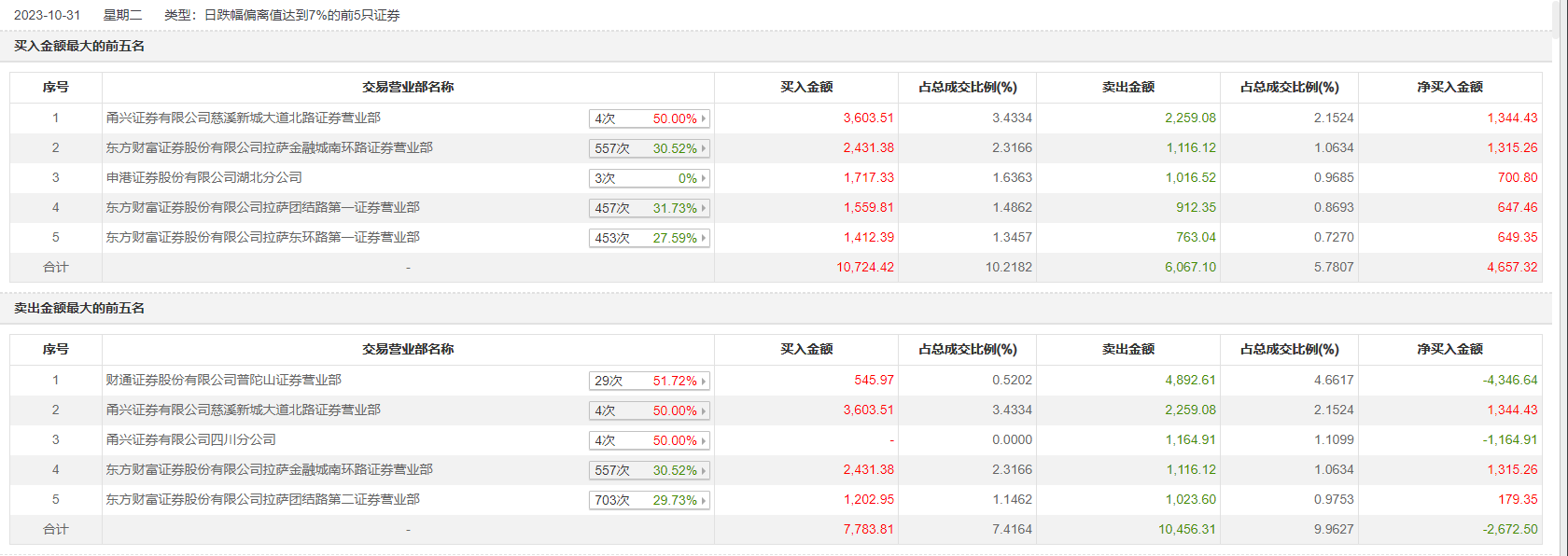 10月31日,龙洲股份今日跌停,全天换手率达25.23%,振幅达2.93%。龙虎榜数据显示,营业部席位合计净卖出674.88万元。其中,财通证券普陀山证券营业部、甬兴证券有限公司慈溪新城大道北路证券营业部分别卖出4892.61万元、2259.08万元;甬兴证券有限公司慈溪新城大道北路证券营业部、东方财富证券拉萨金融城南环路证券营业部分别买入3603.51万元、2431.38万元。