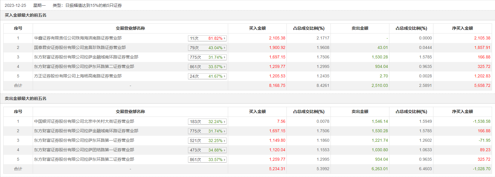 12月25日,龙洲股份今日涨停,全天换手率达25.73%,振幅达19.94%。龙虎榜数据显示,营业部席位合计净买入4137.42万元。其中,华鑫证券珠海海滨南路证券营业部、国泰君安证券宜昌珍珠路证券营业部分别买入2105.38万元、1900.92万元;中国银河证券北京中关村大街证券营业部、东方财富证券拉萨金融城南环路证券营业部分别卖出1546.14万元、1530.28万元。
