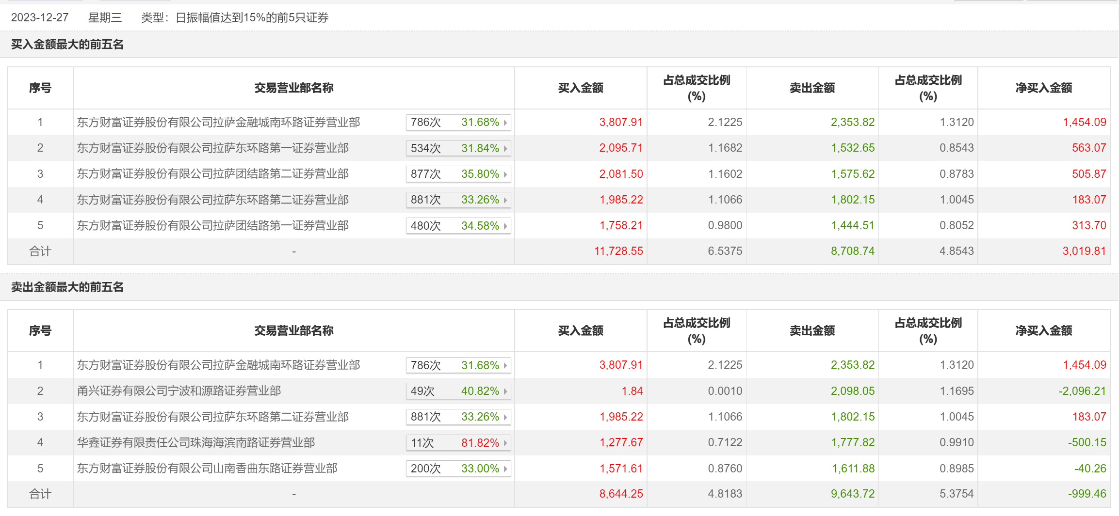 12月27日,龙洲股份今日涨停,全天换手率达39.22%,振幅达16.47%。龙虎榜数据显示,营业部席位合计净买入383.18万元。其中,东方财富证券拉萨金融城南环路证券营业部、东方财富证券拉萨东环路第一证券营业部分别买入3807.91万元、2095.71万元;东方财富证券拉萨金融城南环路证券营业部、甬兴证券有限公司宁波和源路证券营业部分别卖出2353.82万元、2098.05万元。