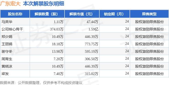 证券之星消息,根据市场公开信息整理,广东宏大(002683)于12月25日将有442.87万股限售股份解禁,为公司股权激励限售股份,占公司总股本0.58%。(本次数据根据历史公告整理得出,实际情况以上市公司最新公告为准)本次解禁后,公司还有9536.73万股限售股份,占总股本12.55%。具体如下图所示: