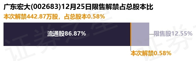 广东宏大(002683)442.87万股限售股将于12月25日解禁,占总股本0.58%