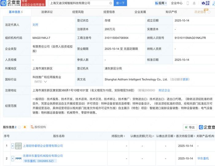 企查查APP显示,近日,上海艾迪汉姆智能科技有限公司成立,法定代表人为刘芳,经营范围包含:智能港口装卸设备销售;特种设备销售;电气设备销售;物料搬运装备销售等。企查查股权穿透显示,该公司由华东重机(002685)等共同持股。