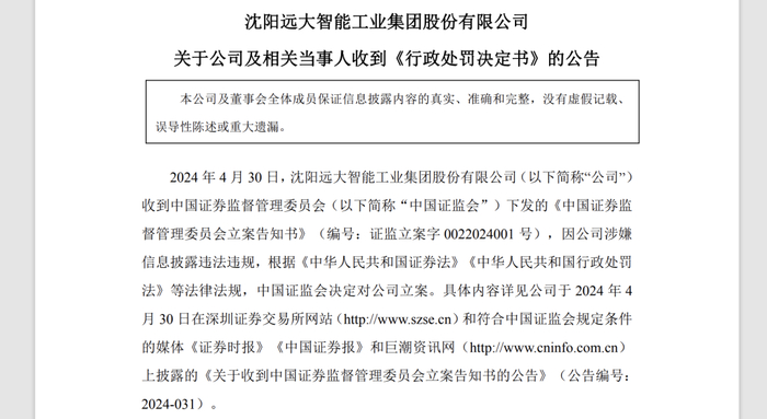 红星资本局12月21日消息,12月19日晚间,沈阳远大智能工业集团股份有限公司(002689.SZ;下称“远大智能”)发布关于公司及相关当事人收到《行政处罚决定书》的公告。