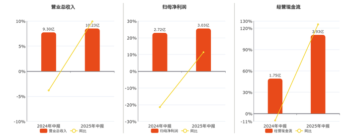 公司营业总收入为10.23亿元,较去年同报告期营业总收入增加9229.09万元,同比较去年同期上涨9.92%。归母净利润为3.03亿元,较去年同报告期归母净利润增加3084.05万元,同比较去年同期上涨11.34%。经营活动现金净流入为3.93亿元,较去年同报告期经营活动现金净流入增加2.19亿元,同比较去年同期上涨125.28%。